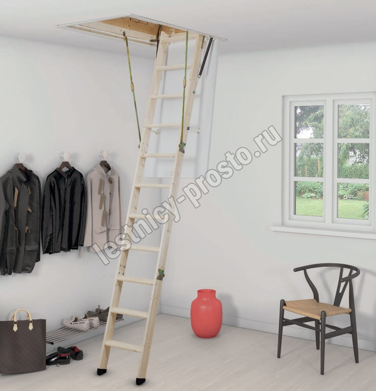 Прочные буковые ступени и направляющие из ели. В модели CLICK FIX 76 люк выполнен из высококачественного изоляционного материала толщиной 70 мм с трех-миллиметровыми плитами HDF белого цвета, что позволяет снизить теплопотери до 0,49 W/m² C°