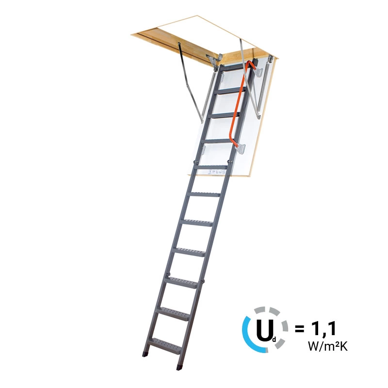 Герметичность всей конструкции достигается благодаря утеплению крышки люка и контурному уплотнению по периметру, что предотвращает возможные теплопотери. Чердачную лестницу очень легко разложить и сложить благодаря наличию специального стержня с четырехугольной насадкой. Установленные в лестнице угловые петли-шарниры нового образца придают ей высокую прочность и надежность, а также предохраняют короб от возможной деформации. Основное преимущество чердачной складной металлической лестницы LMK сводится к ее небольшим габаритам при сохранении высокой функциональности, прочности, надежности и эстетичности конструкции. Монтировать лестницу очень просто, для этого не придется затрачивать много времени и сил. Применение лестничной конструкции этого типа позволяет существенно экономить пространство. Монтажный комплект LXK в комплекте не поставляется.