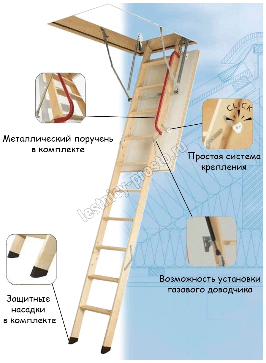 Для большего удобства и безопасности эксплуатации лестница оснащена боковым металлическим поручнем, а пластиковые наконечники (кроме 4-х сегментных лестниц с высотой 335 см и моделей с длиной короба 94 см) предохраняют поверхность пола от повреждения и увеличивают устойчивость конструкции. Утепленная крышка люка облицована ДВП белого цвета, что делает ее практически незаметной при установке в светлом или белом потолке. Соединение тетивы боковых элементов и ступеней лестницы в крепление «ласточкин хвост» гарантирует надежность и прочность конструкции. Ступени не соприкасаются с крышкой лестницы, а противоскользящие выемки обеспечивают комфорт и безопасность использования.