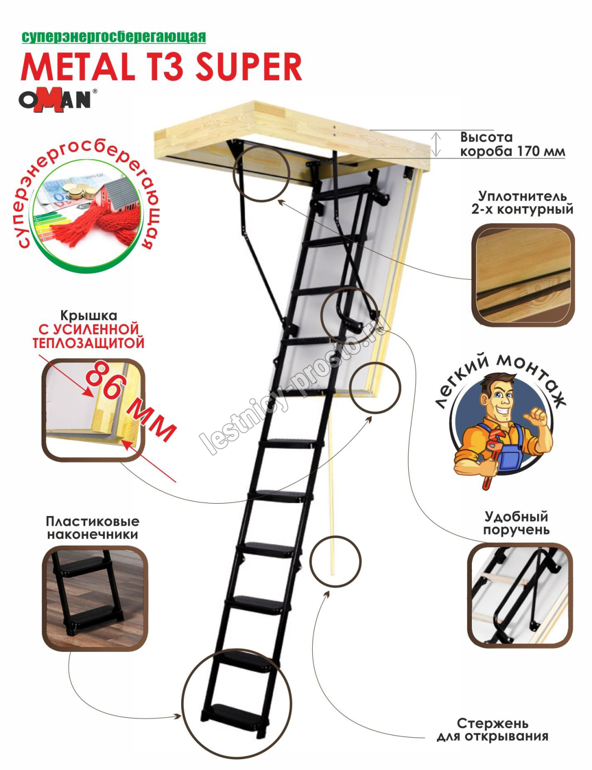Чердачная лестница OMAN Metal T3 SUPER 70×140 см, h-280 см