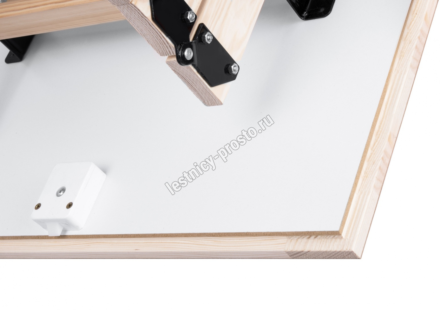 Лестница складная четырехсекционная, изготовлена из массива сосны. Термоизоляционная крышка типа "сэндвич" утеплена пенопластом толщиной 20 мм, облицована с двух сторон ДСП белого цвета