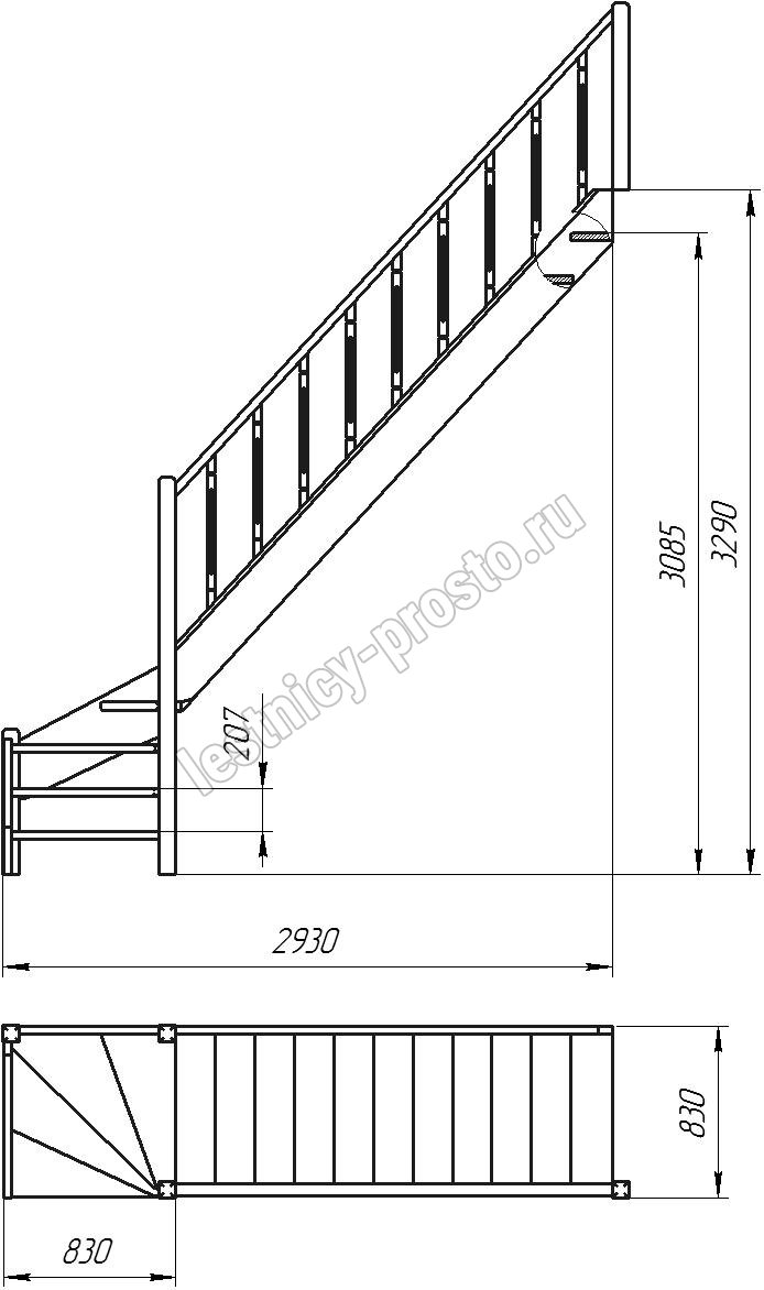 Деревянная межэтажная лестница ЛЕС-07 3085-3290 проем 2930-830, Сосна