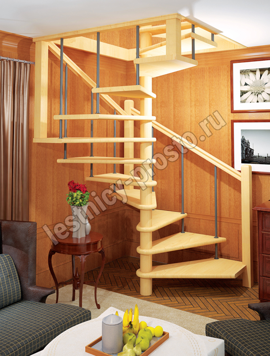 Компактная деревянная лестница с металлическими стойками перил. Легко собирается и занимает небольшое пространство на первом и втором этаже. Фиксированный квадратный короб на верхнем уровне обеспечивает дополнительную прочность конструкции. Монтаж осуществляется силами двух человек на объекте по указаниям, приведенным в паспорте на лестницу.