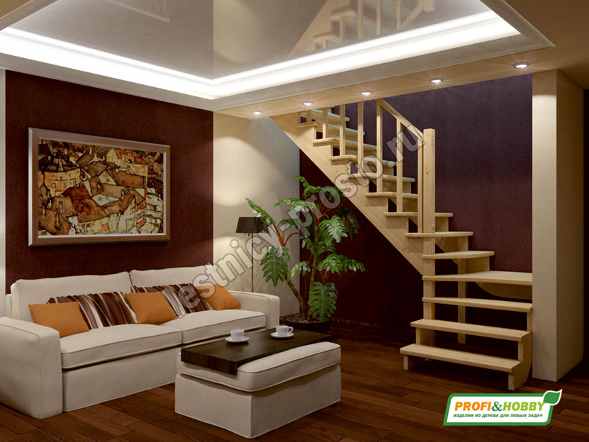 Ступени и поручень лестницы выполнены из дуба, остальные элементы из сосны. Возможно изготовление данной модели полностью из дуба. Базовый комплект включает в себя деревянные элементы лестницы и ограждения без какого-либо покрытия.