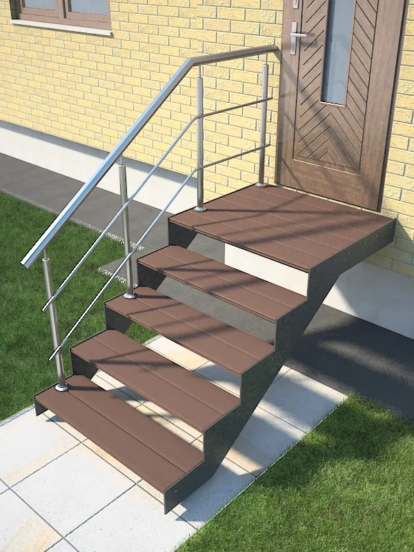 Ступени лестницы состоят из металлической рамки, обеспечивающей необходимую прочность, и покрытия из террасной доски ДПК (древесно-полимерный композит). Ступени не боятся воды и мороза, не теряют со временем свой внешний вид и не требуют ухода.
