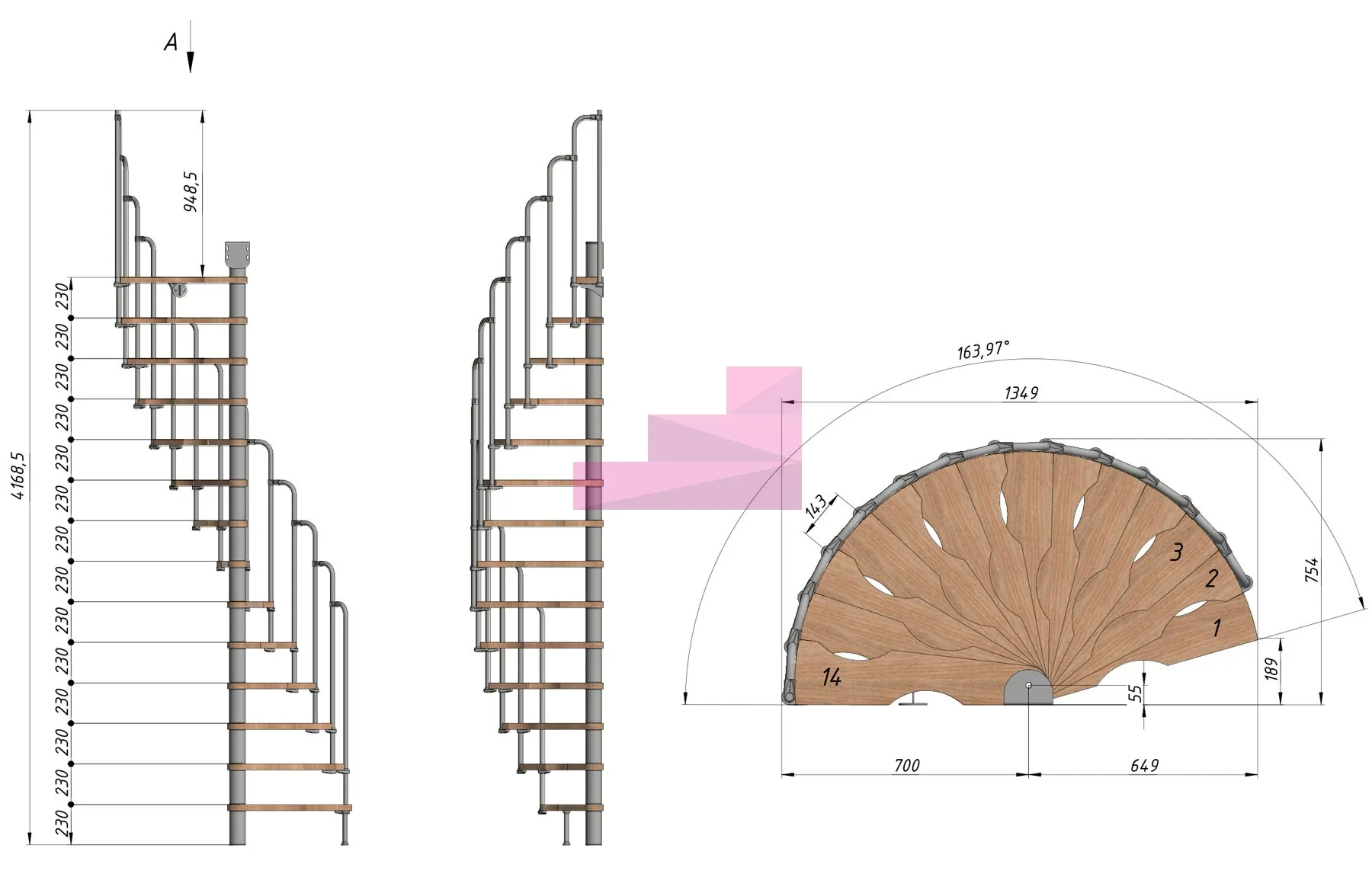 | Винтовая лестница PROSTO MINI, 70×140 см, h231,1-252 см |