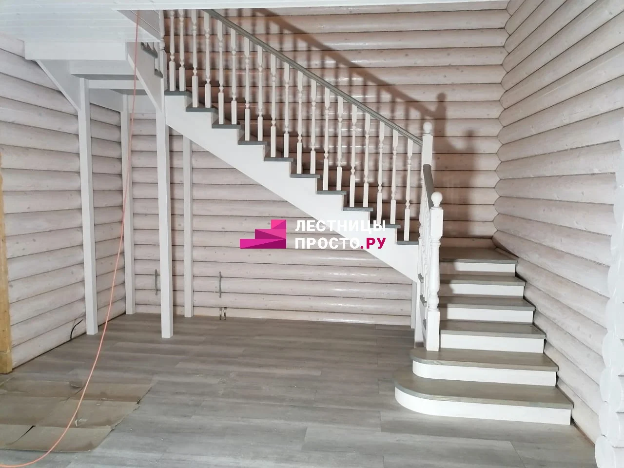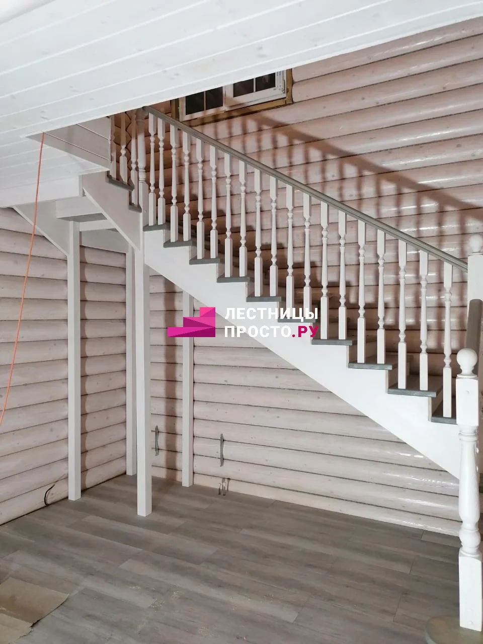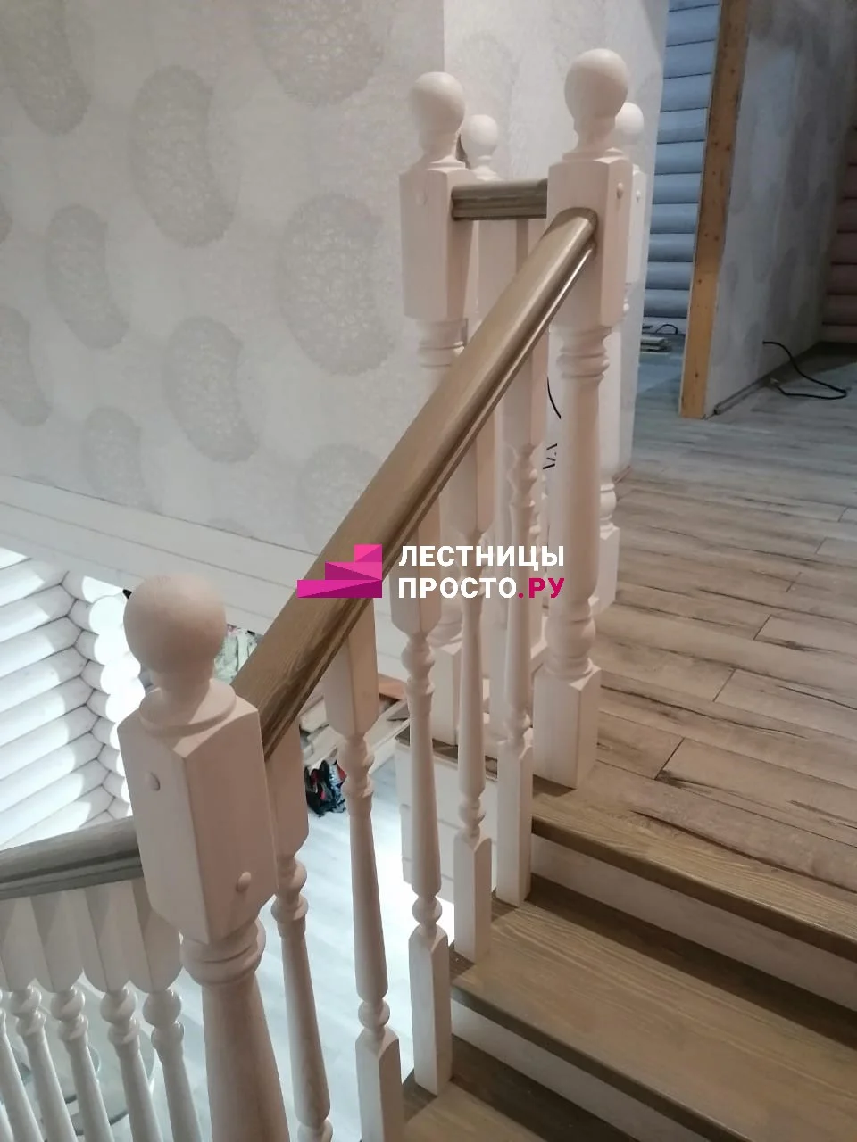Ступени и поручень выполнены из ясеня паркетной склейки, столбы, косоуры, подступёнки - сосна.